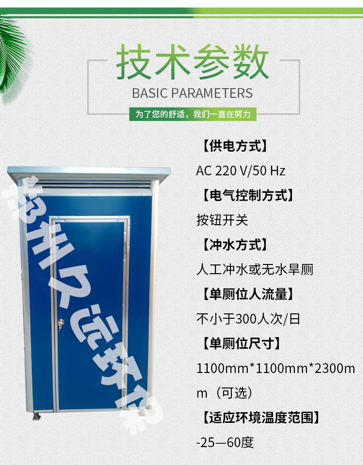 移動(dòng)廁所不受任何工作環(huán)境的限制,外形結(jié)構(gòu)輕巧,顏色搭配合理。 適用于一般城市街道、旅游景區(qū)、公園綠化、車站、碼頭、生活小區(qū)、建筑工地、廣場(chǎng)等人口密集的公共場(chǎng)所及繁華商業(yè)街等場(chǎng)所。 移動(dòng)洗手間具有可移動(dòng)性、方便運(yùn)輸、安裝簡(jiǎn)單等優(yōu)點(diǎn)。 移動(dòng)廁所水沖式內(nèi)部配置: 蹲便器、沖水箱、洗手池、排風(fēng)扇、照明開(kāi)關(guān)、...